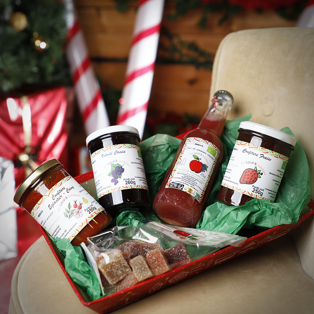 Cette corbeille de Noël bio est un cadeau raffiné et généreux, parfait pour les amateurs de produits naturels et savoureux. Présentée dans une élégante corbeille festive, elle contient un assortiment de douceurs bio soigneusement sélectionnées : un pot de confiture d’églantier-coing (250 g), un pot de confiture de fraise (250 g), un pot de confiture de cassis (260 g), une bouteille de jus de fruits pomme-cassis (25 cl), et une boîte de pâtes de fruits assorties (150 g). Idéale pour offrir ou partager, cette corbeille combine des saveurs authentiques et des produits de qualité, issus de l’agriculture biologique, pour des moments gourmands et responsables.